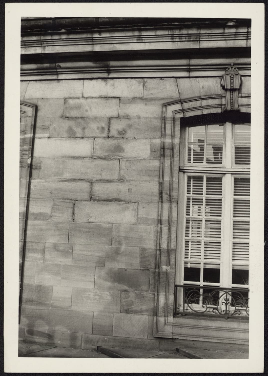 Vue de détail de maçonnerie, d’une baie et d’une corniche du pavillon nord-ouest.