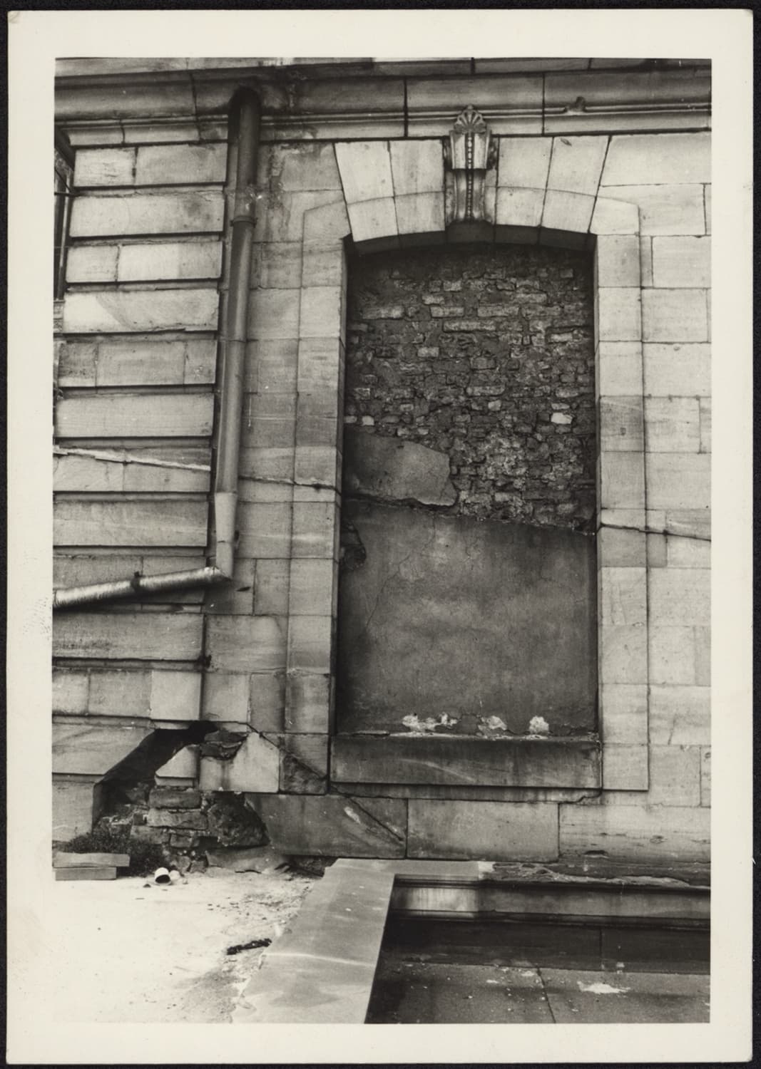 Vue de détail de claveaux disjoints et des pierres altérées de l’angle gauche du côté sud du pavillon nord-ouest.