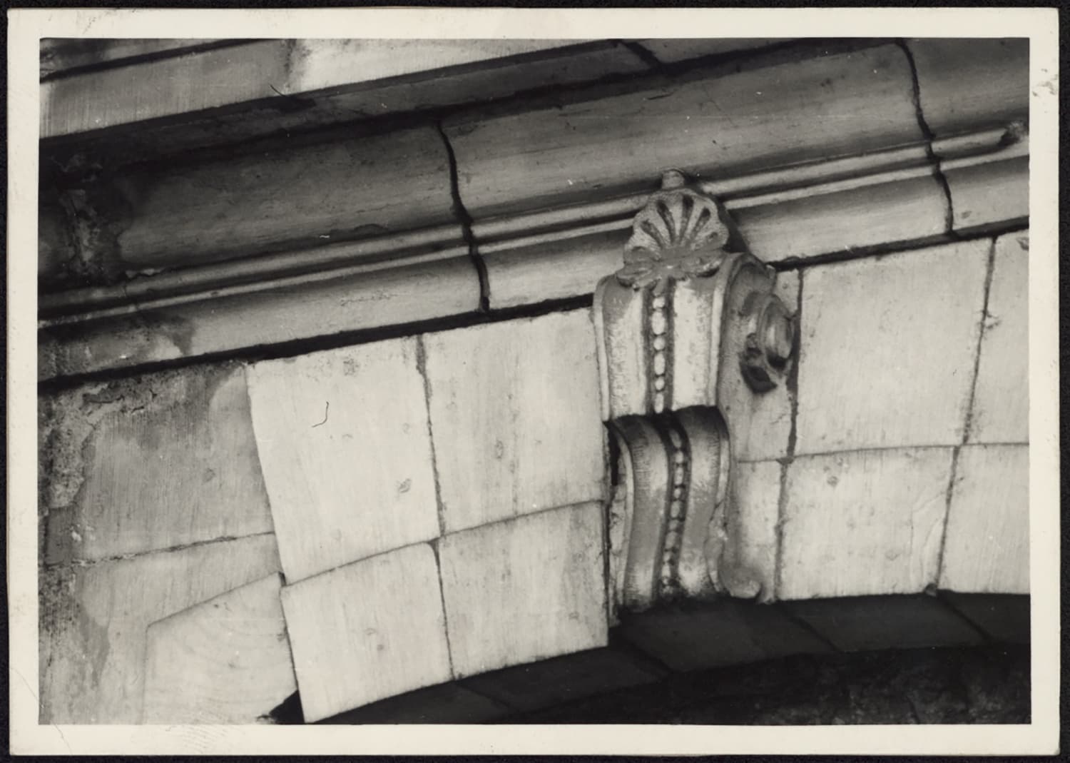 Vue de détail d’une corniche et d’une clef de bois du côté sud du pavillon nord-ouest.