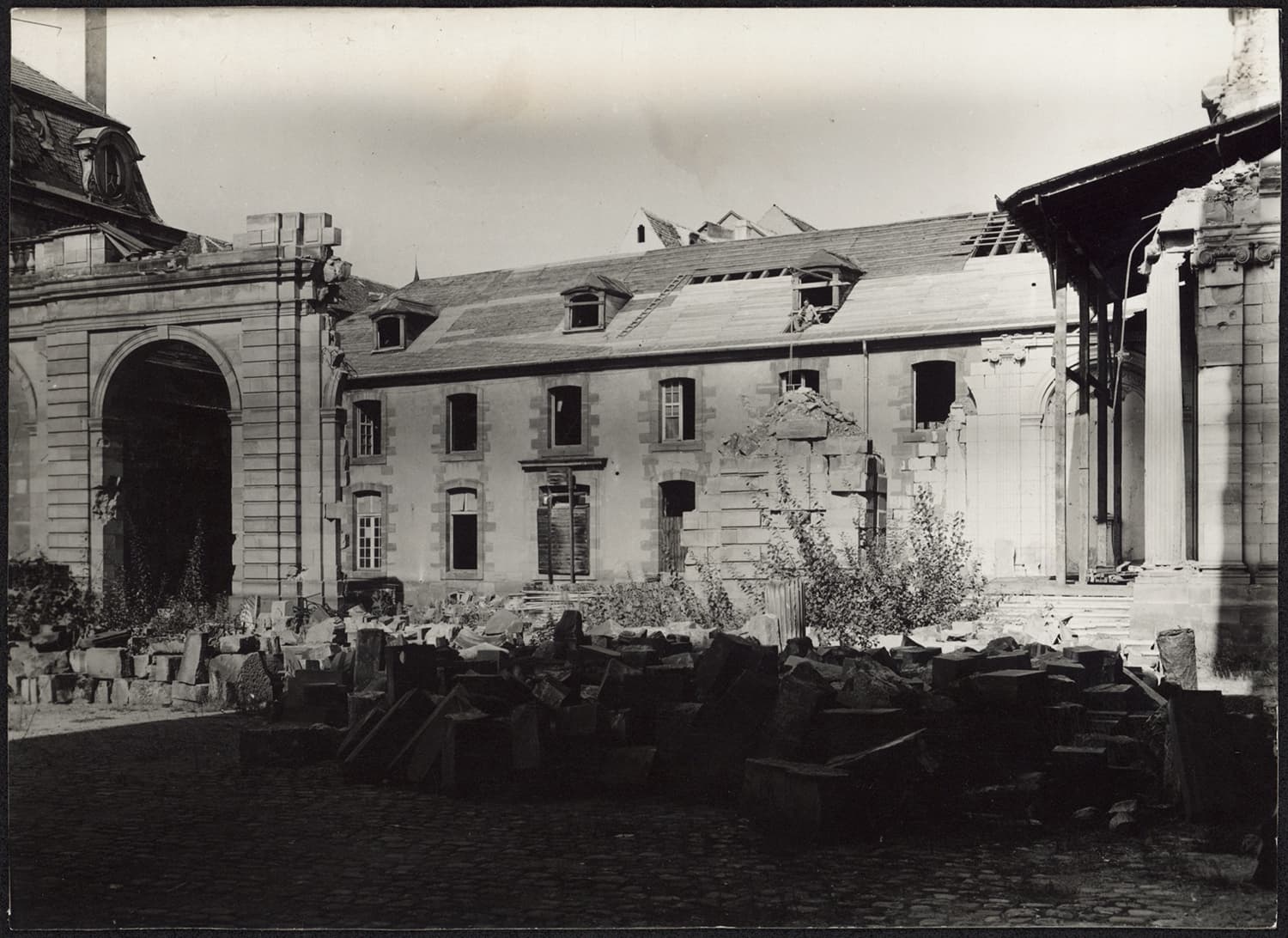 Vue d’ensemble de la couverture de l’aile est et du démantèlement du mur de séparation depuis la cour d’honneur.