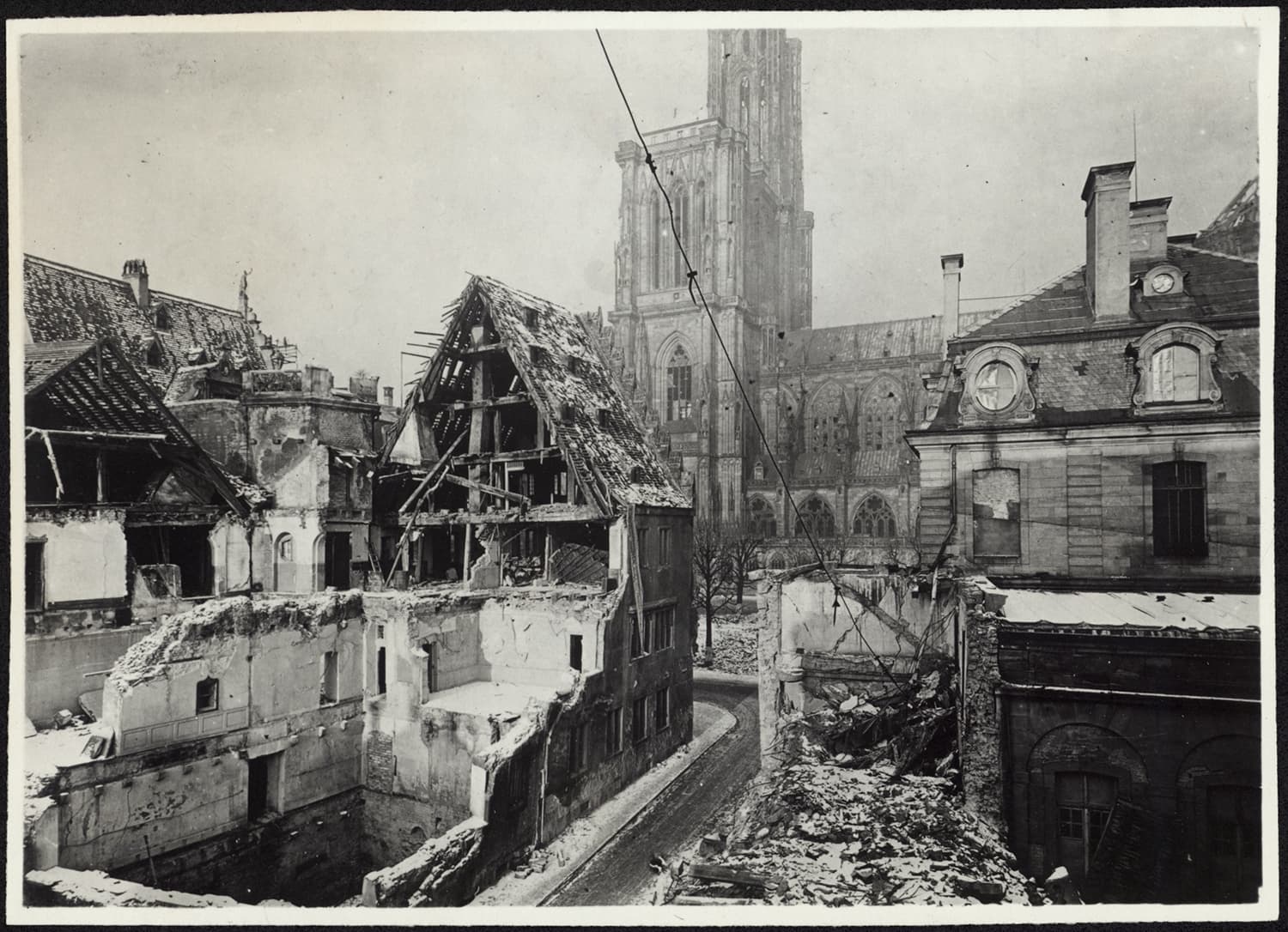 Vue d’ensemble des dommages de guerre sur l’aile ouest depuis la rue du Bain-aux-Plantes.