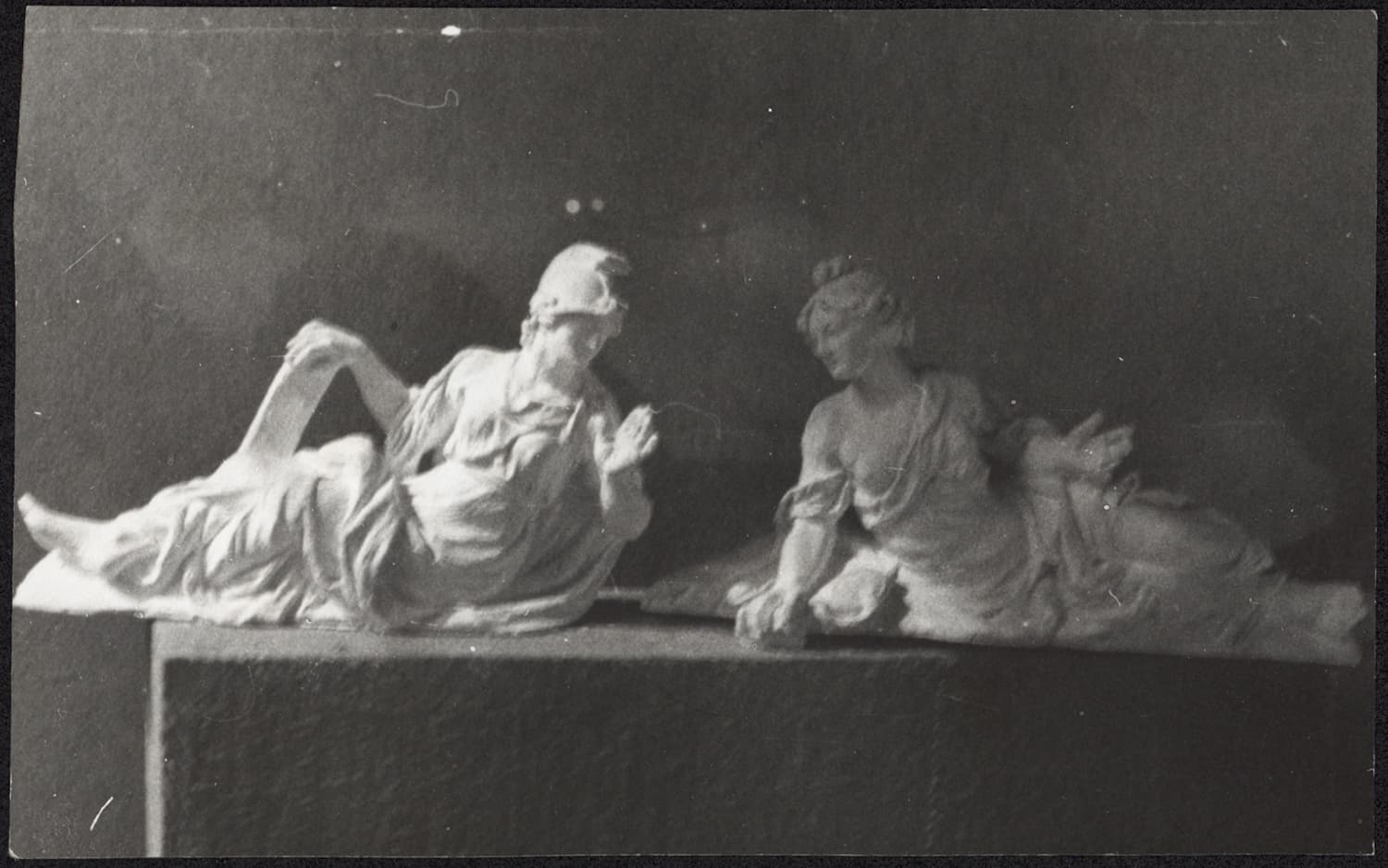 Vue d’ensemble des moulages des statues du fronton nord du corps de logis.