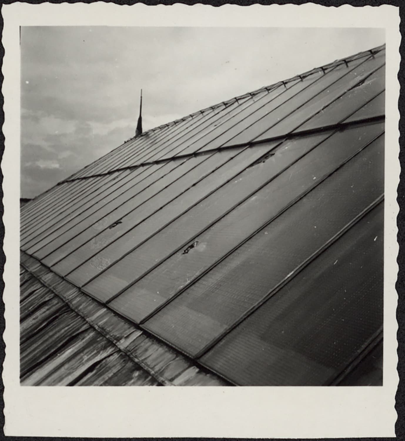 Vue de détail des dommages provoqués par la grêle sur une verrière.