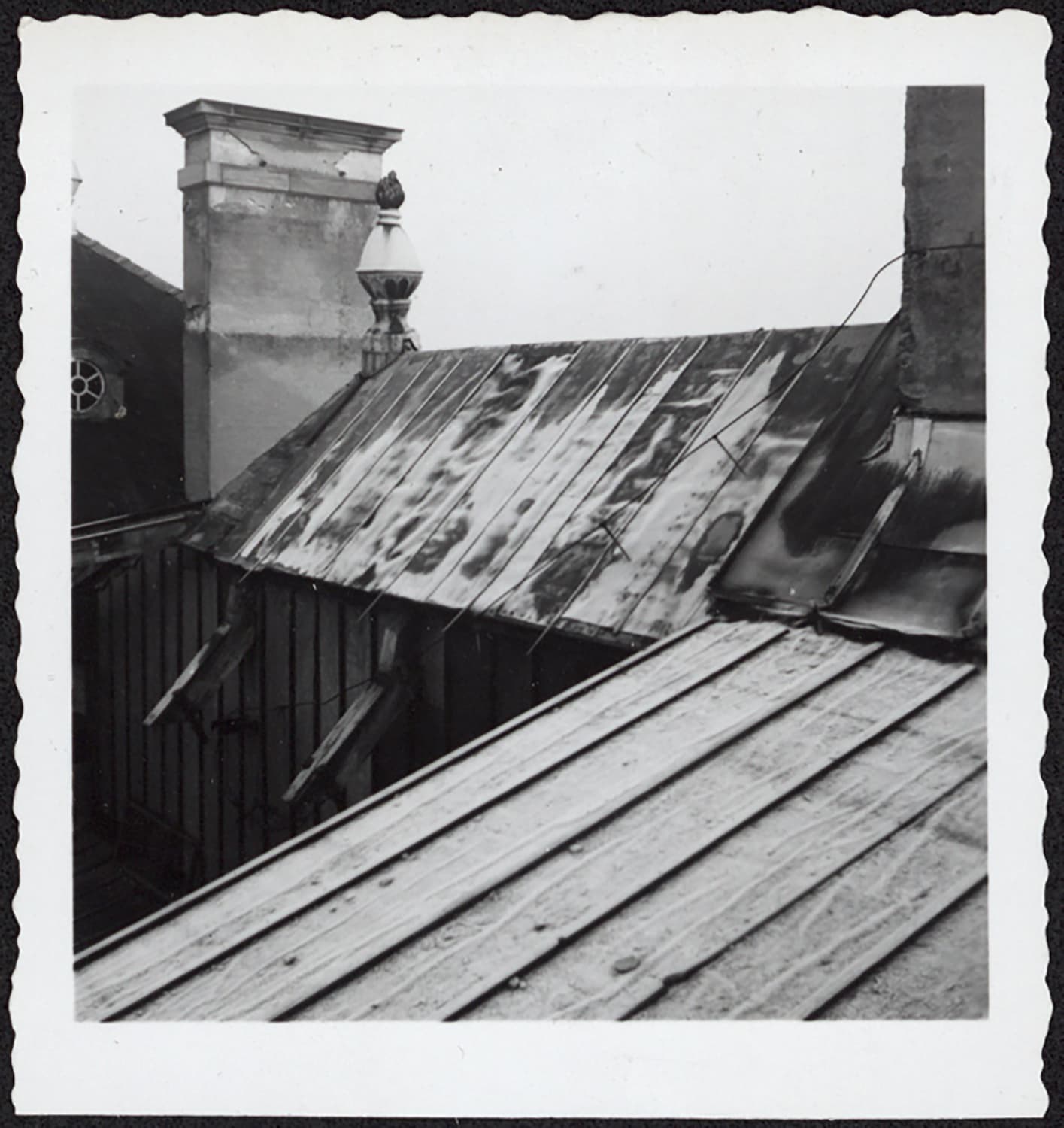 Vue de détail de la couverture provisoire sur le versant intérieur du corps de logis.