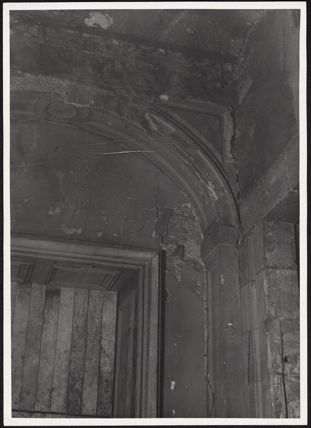 Vue des dommages de guerre sur le grand escalier au premier étage du corps de logis.