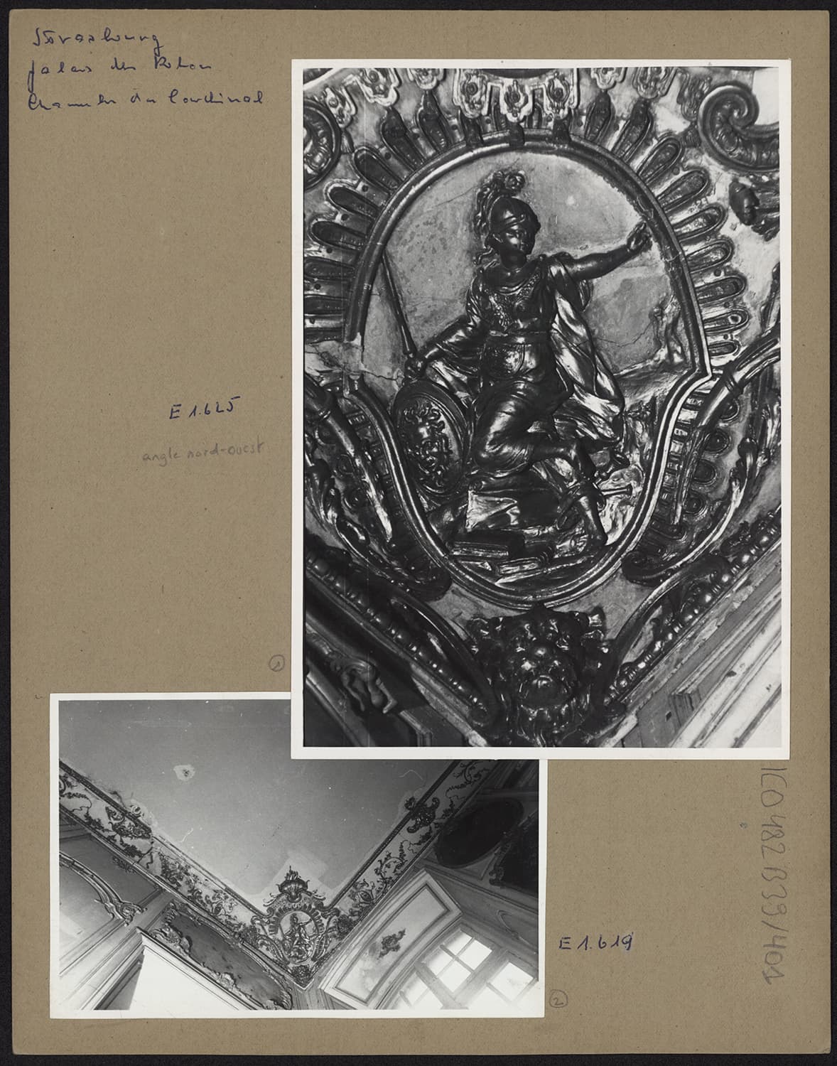 Vues de détails de l’angle nord-ouest et du cartouche sculpté de la Philosophie de l'angle sud-ouest de la chambre du cardinal.