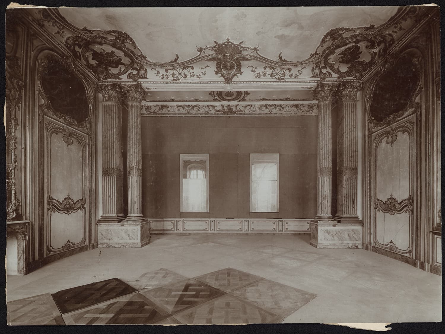 Vue d’ensemble de l’alcôve de la chambre du roi vidée de son mobilier.