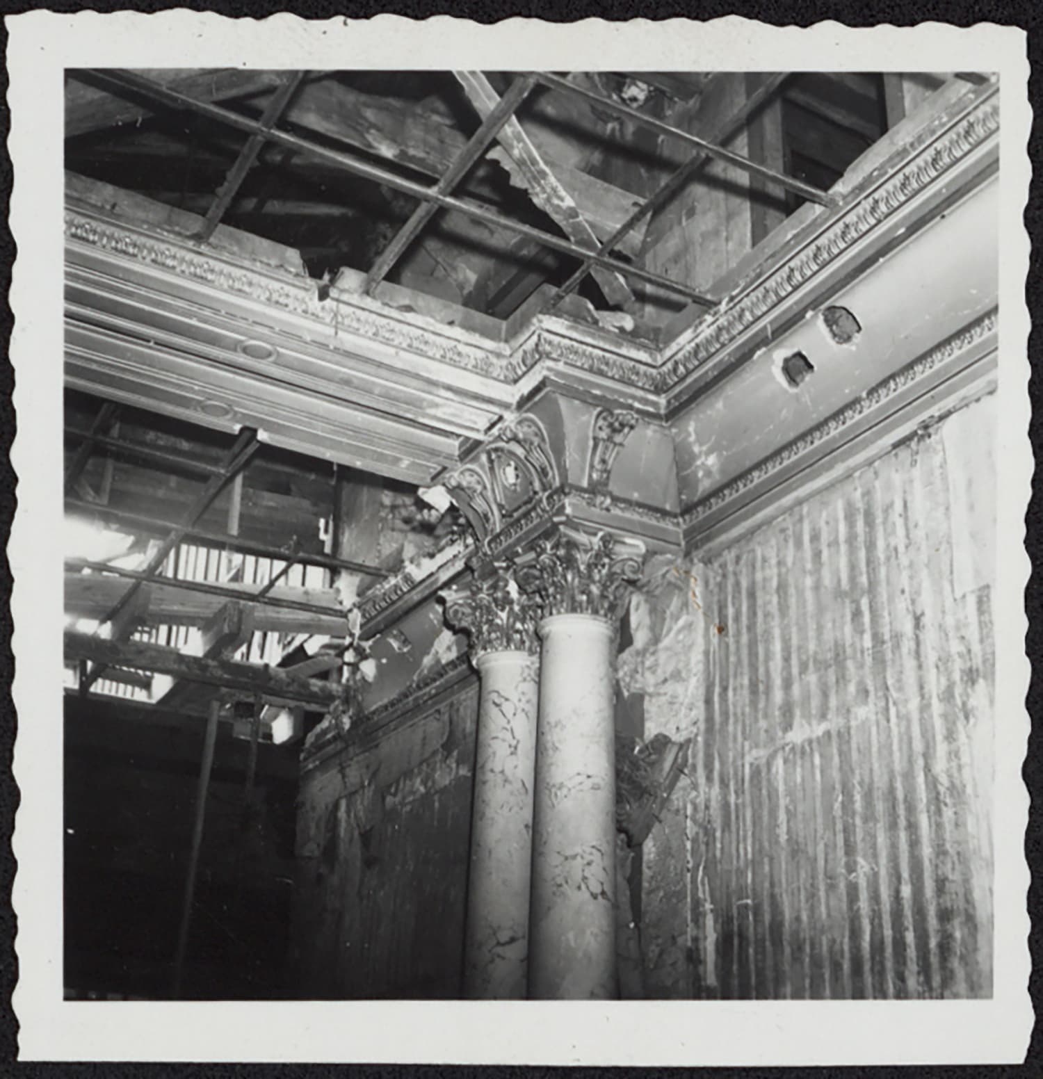 Vues de détails de deux colonnes jumelées et d’un plafond du corps du logis.