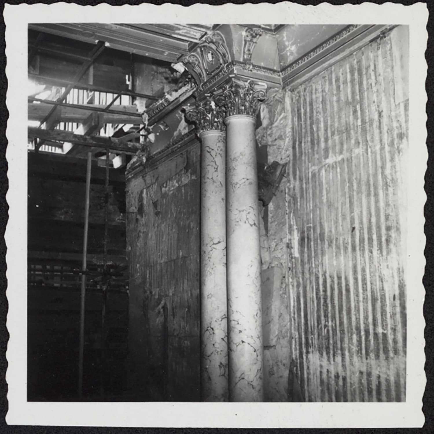 Vues de détails de la base de deux colonnes jumelées et d’un plafond du corps du logis.