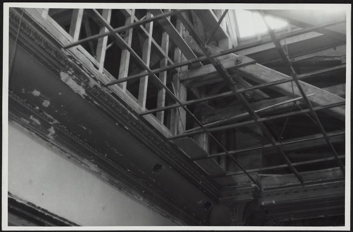 Vue de détail de la structure métallique de la verrière de la galerie du premier étage du corps du logis.