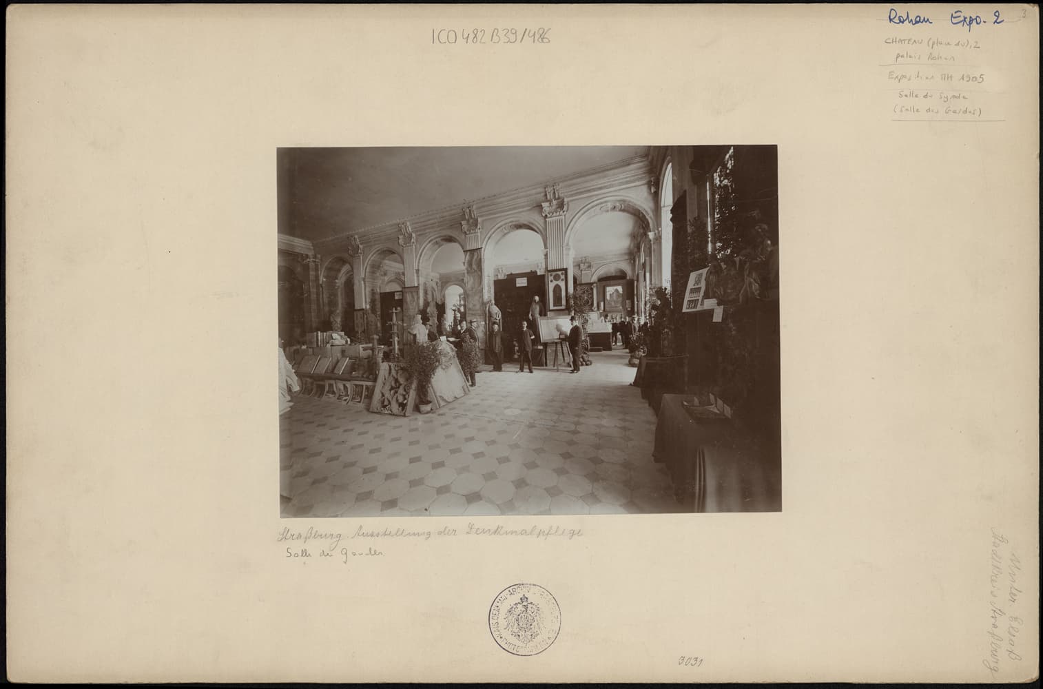Vue d’ensemble de l’exposition de 1905 relative aux monuments historiques dans la salle du synode.