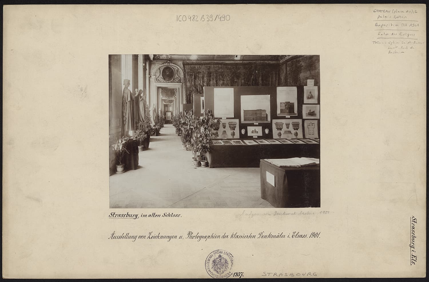 Vue d’ensemble de l’exposition de 1901 relative aux monuments historiques dans le salon des évêques (salle consacrée à l’église Saint-Pierre-et-Saint-Paul de Rosheim).