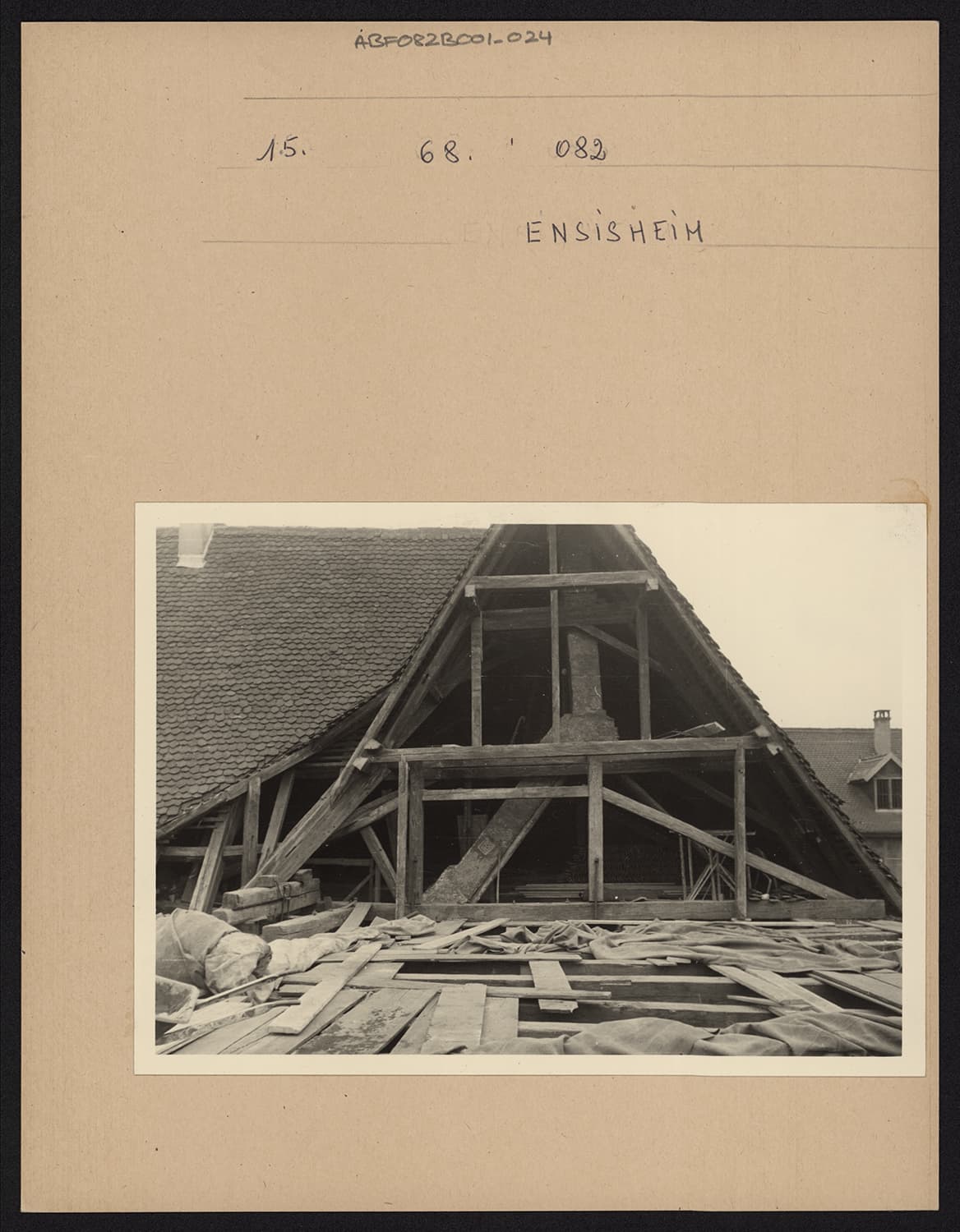 Vue d’ensemble de la charpente en cours de restauration.