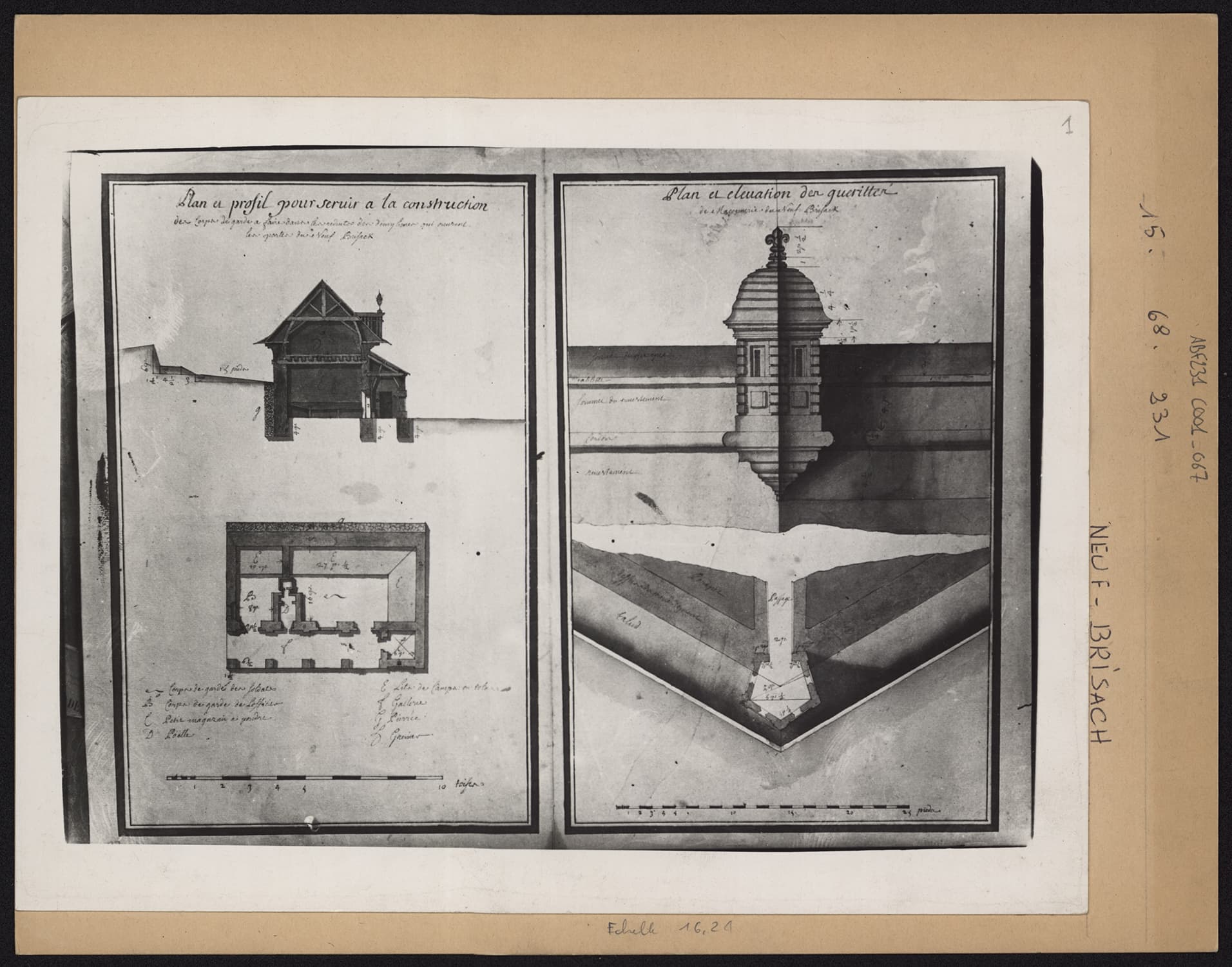 Plans de masse et élévations d’un corps de garde et d’une guérite du rempart.