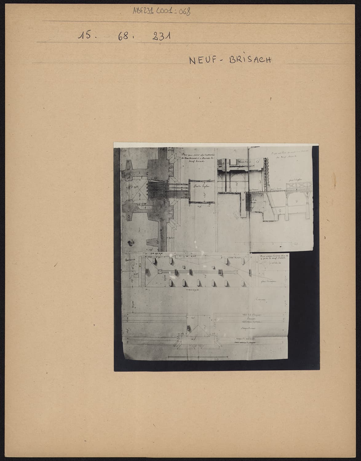 Plan de masse et coupe des ponts dormants et à bascules, plans d’une porte de ville.