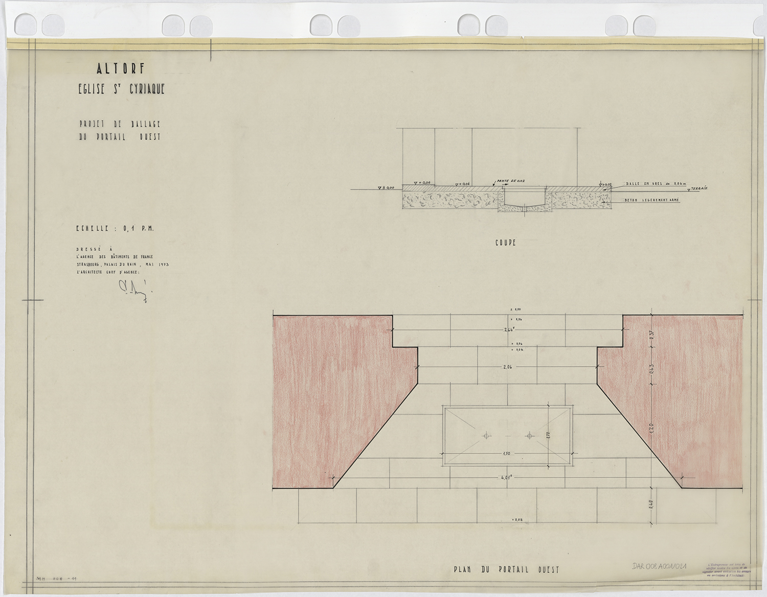 Projet de dallage pour le portail ouest, plan de masse et coupe.
