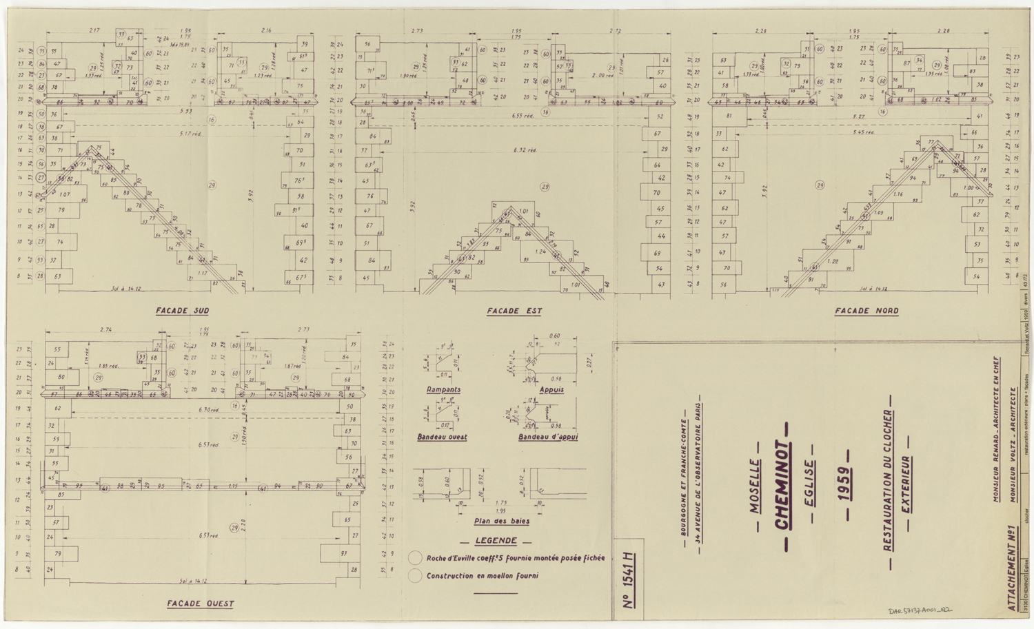 Restauration extérieure du clocher, relevés des façades et plan des baies.