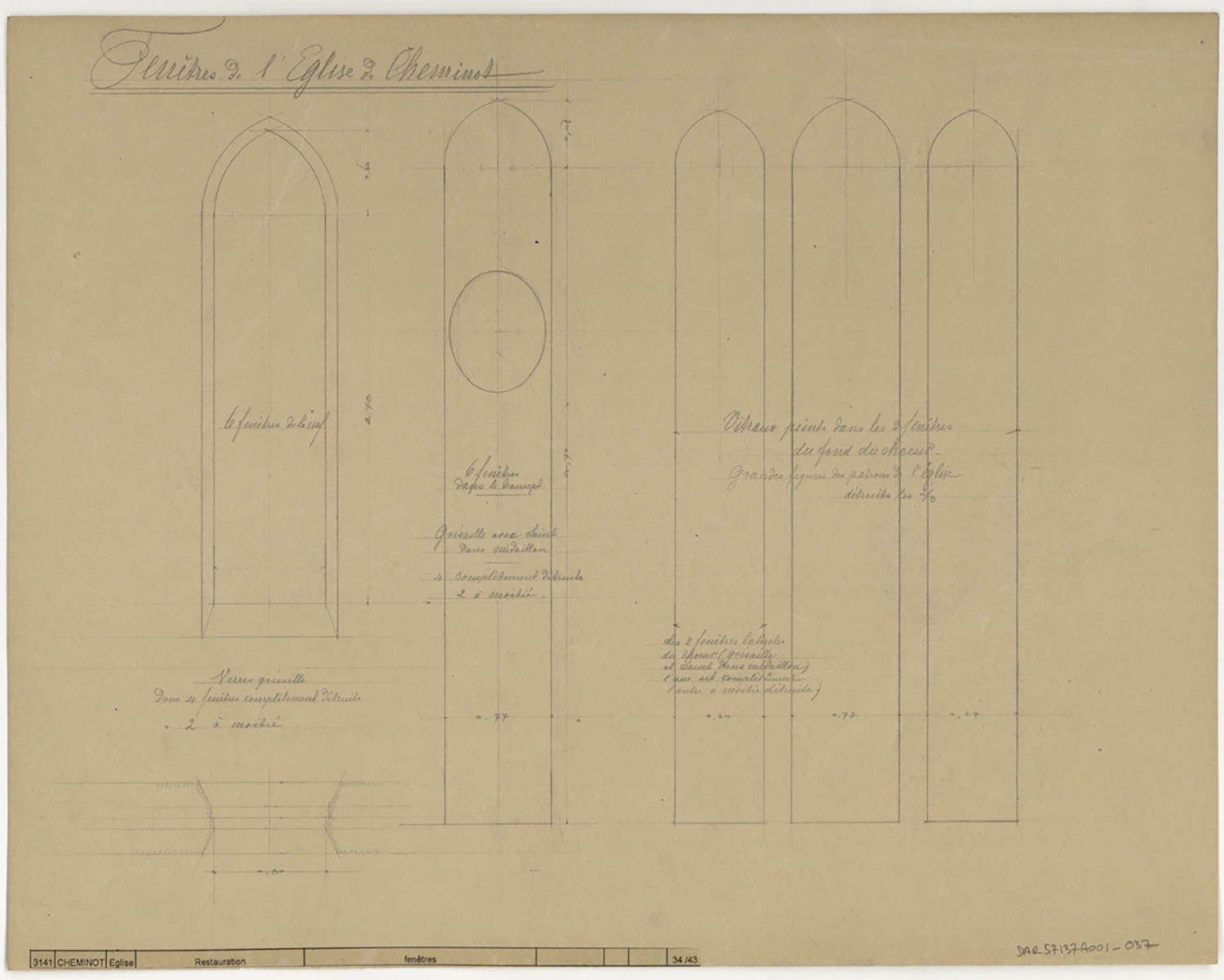 Relevé des baies de la nef et de leurs vitraux, plan d’une embrasure.