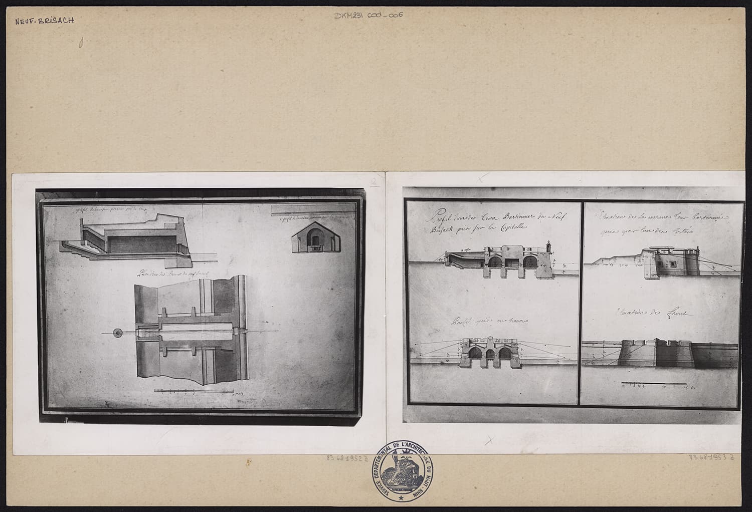 Plans de masse, élévations et coupes d’une poterne et d’une tour bastionnée.