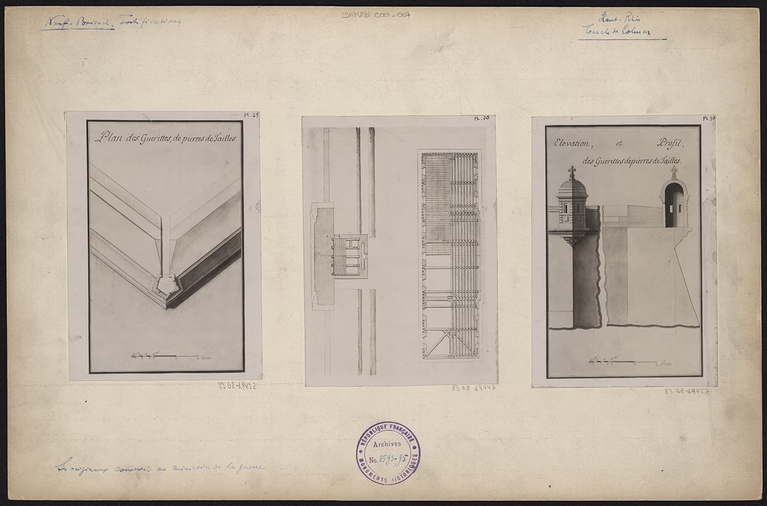 Plans de masse, élévation et coupe d’une guérite.