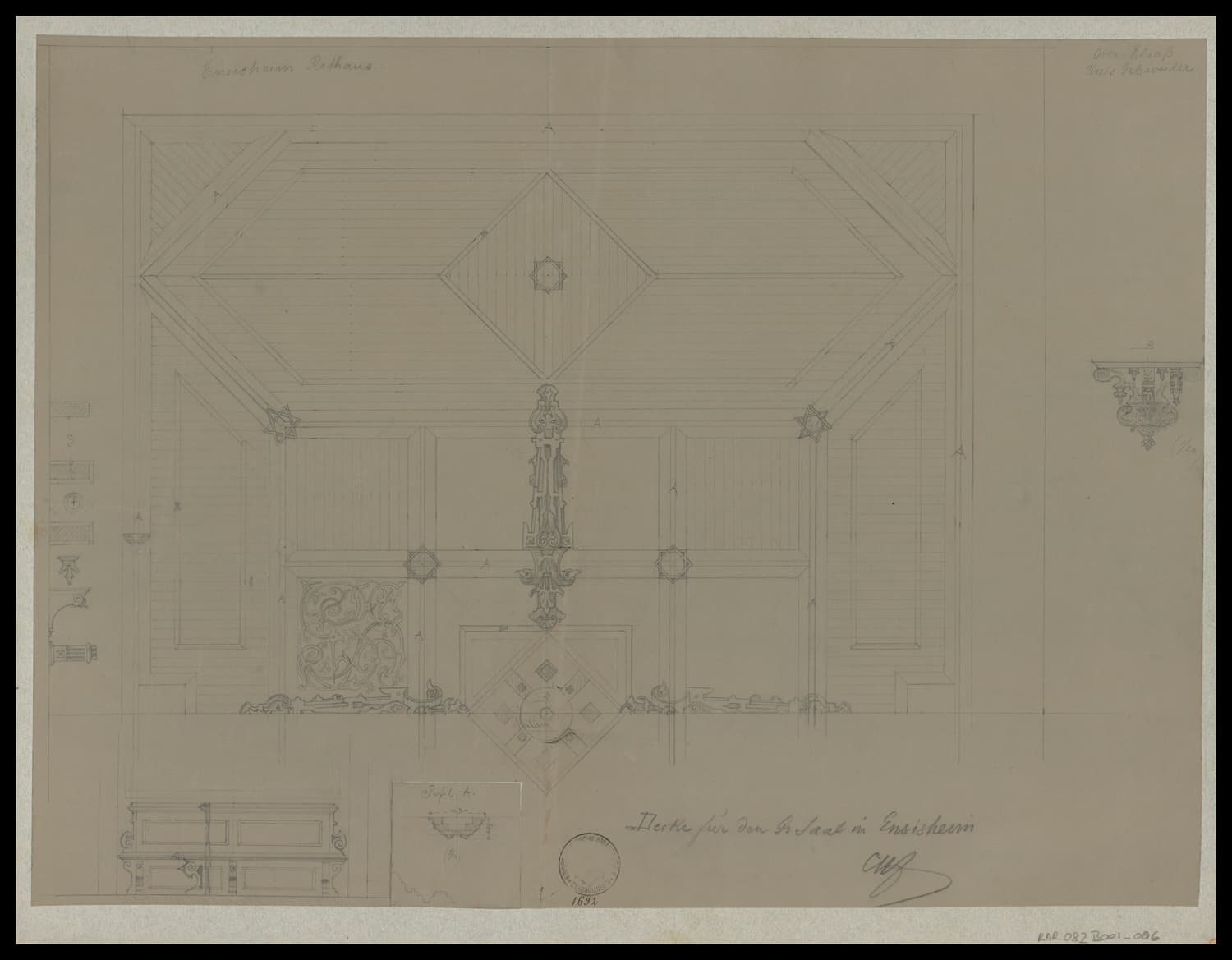 Projet de nouveau plafond pour la salle des séances, plan et détails.