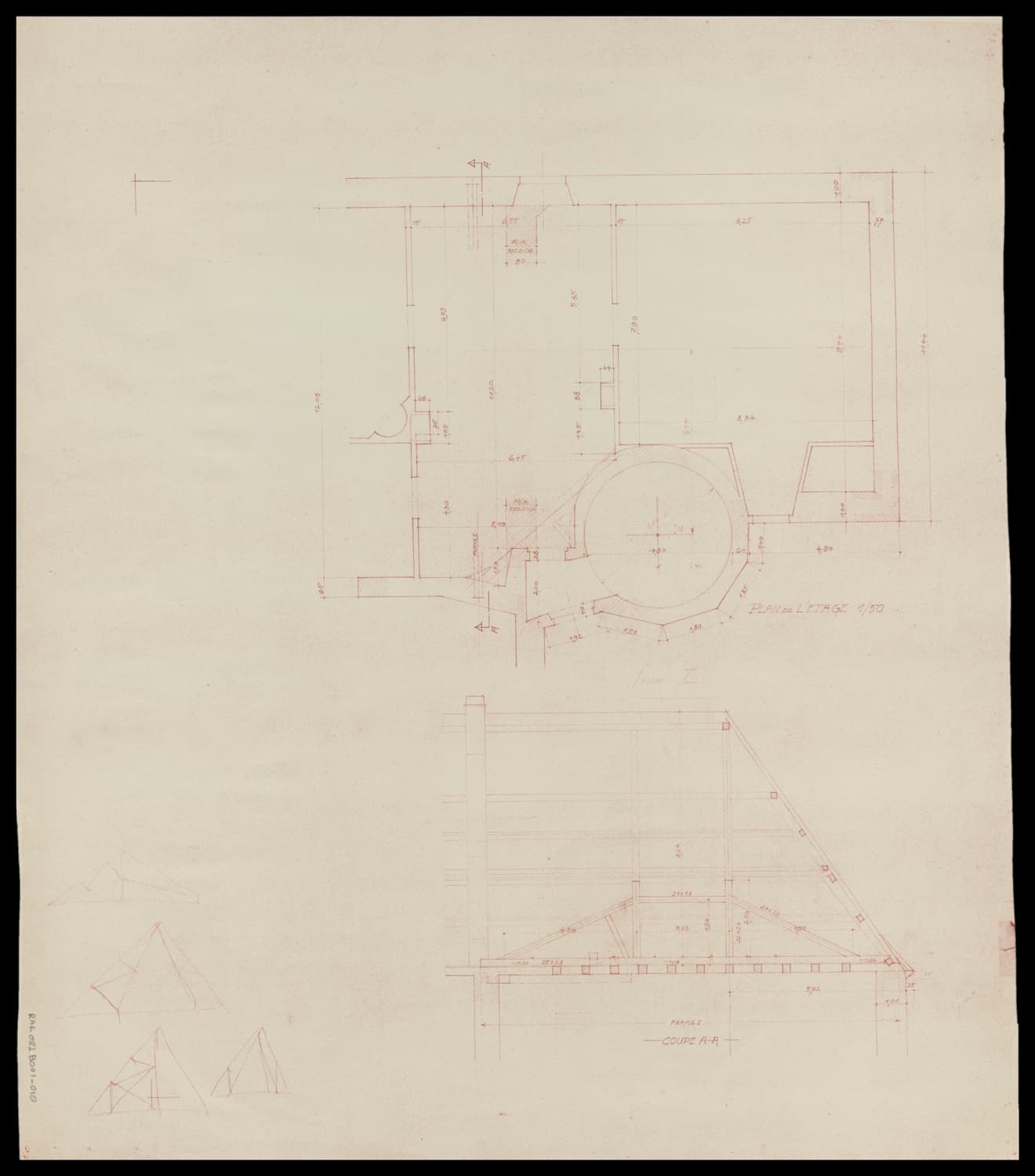 Plan de masse partiel de l’étage et coupe longitudinale sur la charpente.