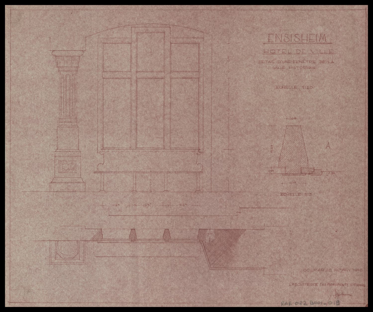 Salle des séances, plan, élévation et détail d’une fenêtre.