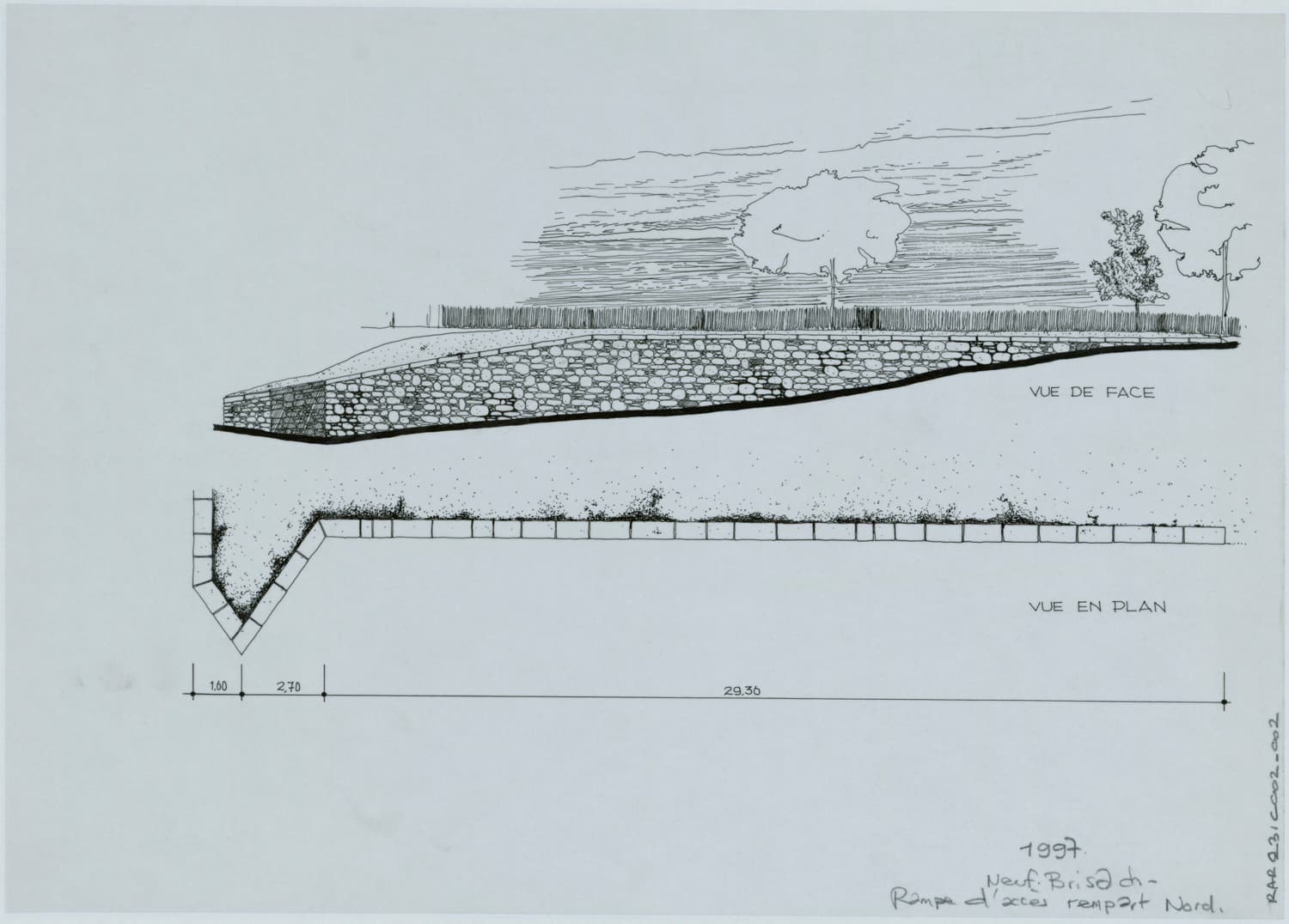 Plan et vue de face de la rampe d’accès du rempart nord.