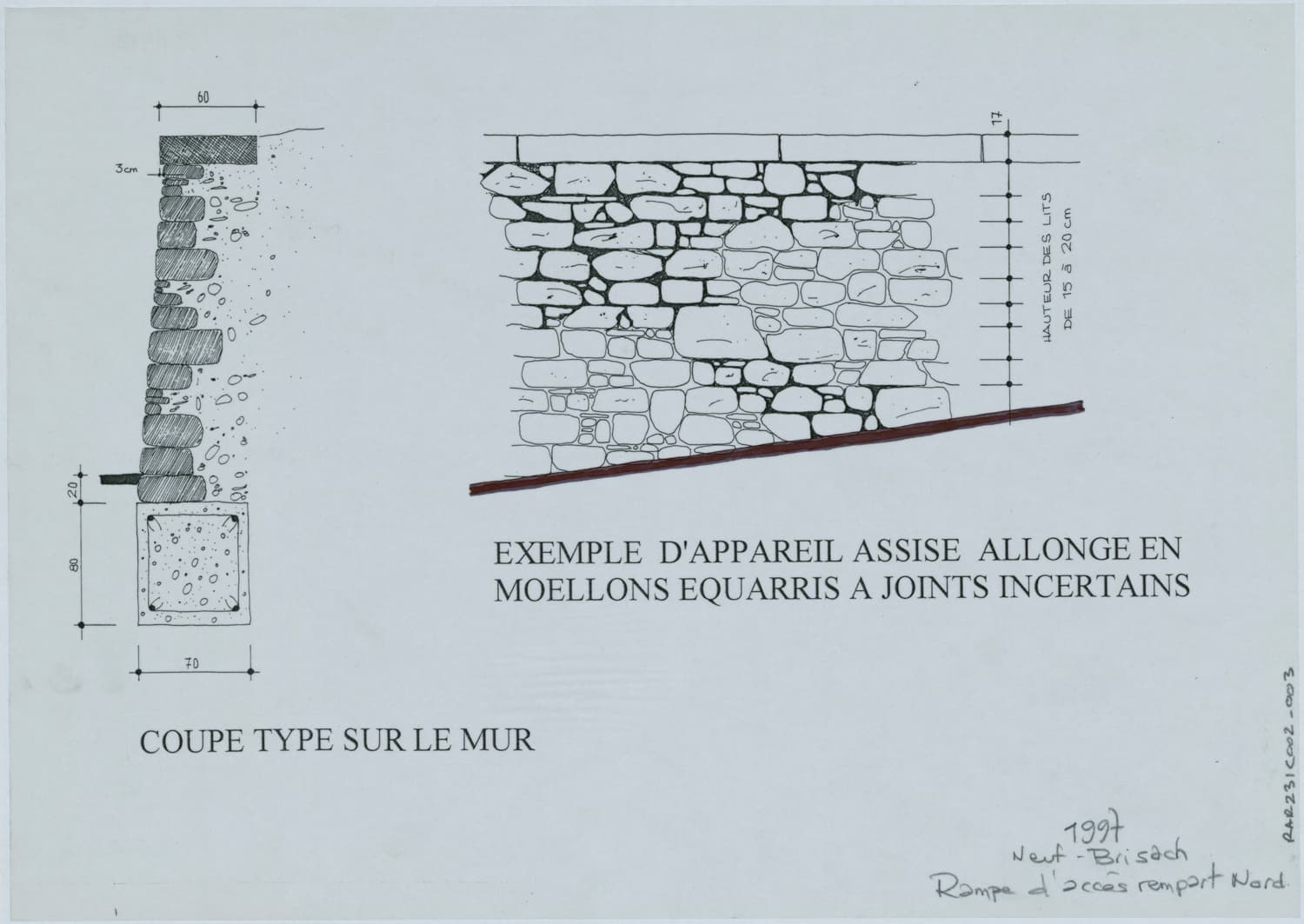Rampe d’accès du rempart nord, coupe type sur le mur et exemple d’appareil.