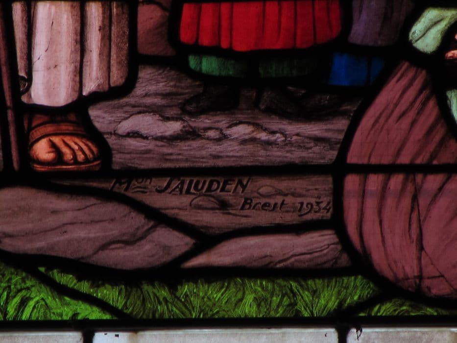 verrière : Saint Jaoua évangélise le pays du Faou, détail de la signature