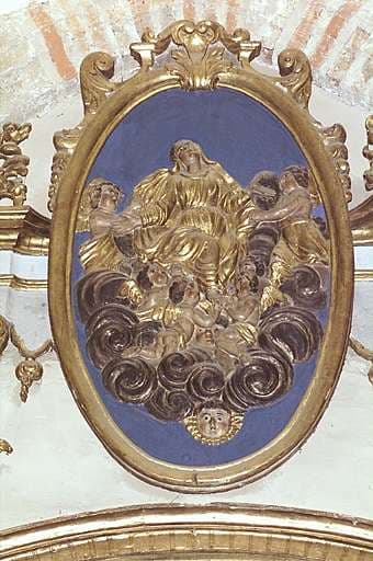 retable du maître-autel. Médaillon de l'Assomption, avant dépose et nettoyage (atelier Lacoste, novembre 2000 - février 2001).