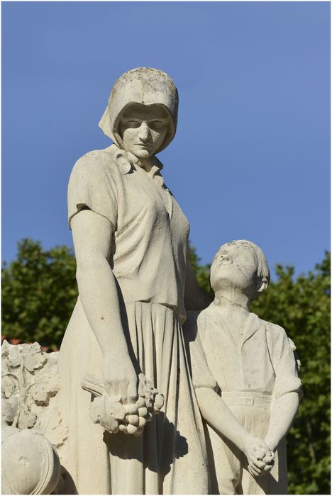 Groupe sculpté. Femme et enfant près d'une croix. Vue latérale.