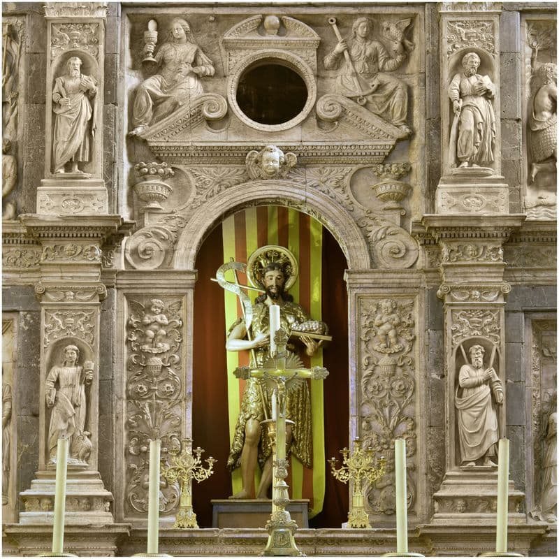 Retable du maître-autel. Panneau central avec statue de Jean-Baptiste.