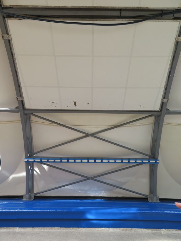 Vestiaires. Banc moulé en polyester, suivant la courbe de la coque.
