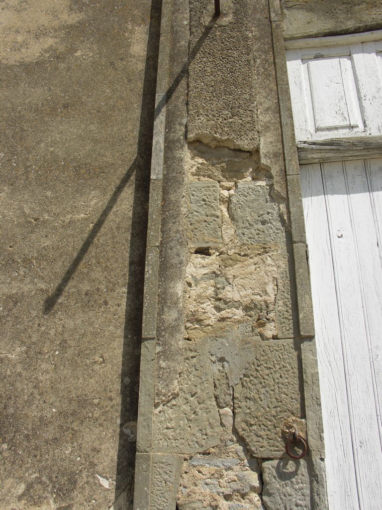 Communs. Cour semi-circulaire des communs. Pavillon du régisseur. Détail de l’enduit des pilastres.