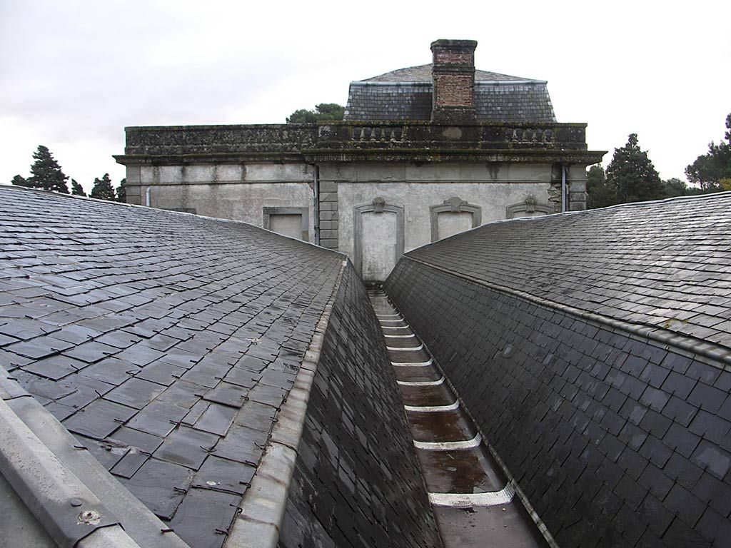 Château. Pavillon est et toiture en ardoises de l’orangerie est.