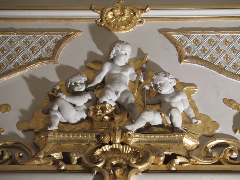 Château. Intérieur. Le grand salon. Détail des boiseries néo-rococo. Putti. Représentation de l’Architecture