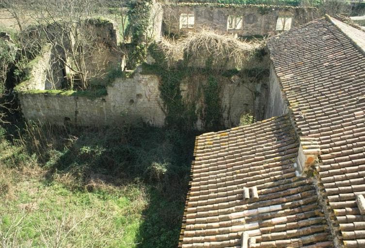 Bâtiments abbatiaux en ruine, vus depuis les toits de l'église.