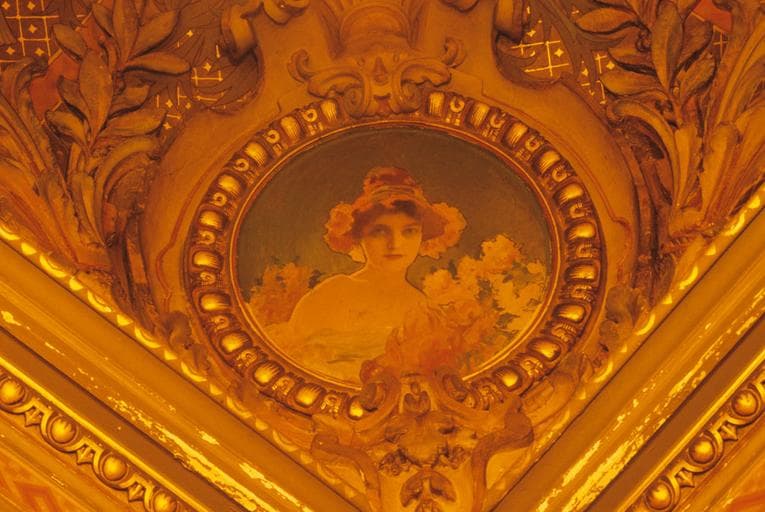 Intérieur ; cage d'escalier ; détail du décor : médaillon peint : tête de femme. Peintures de Paul Gervais.