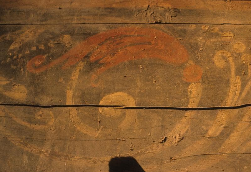 Vue intérieure ; plancher aux poutres peintes, au-dessus du plafond de l'actuelle salle du restaurant La Galiote ; détail des peintures.