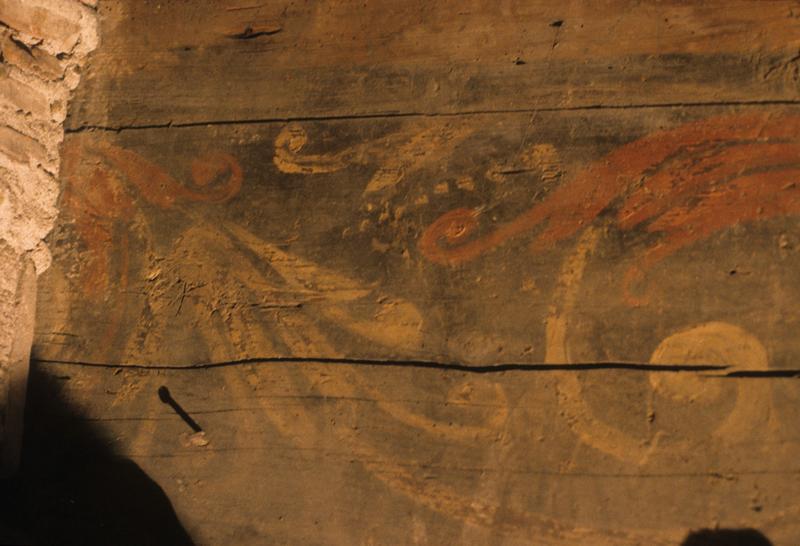 Vue intérieure ; plancher aux poutres peintes, au-dessus du plafond de l'actuelle salle du restaurant La Galiote; détail des peintures ; rinceau.