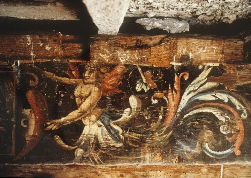 Vue intérieure ; plancher aux poutres peintes, au-dessus du plafond de l'actuelle salle du restaurant La Galiote; détail des peintures ; personnage fantastique.