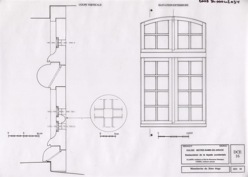 Eglise Notre-Dame-de-Grâce, restauration de la façade occidentale : menuiseries du 2ème étage, coupe verticale et élévation extérieure. DCE 16.