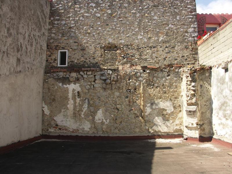 Enclos canonial. Maison 5 place du chapitre. Parcelle 296. Cloître. Côté sud. Vestiges de l'angle sud-ouest et corbeaux de la toiture des galeries.