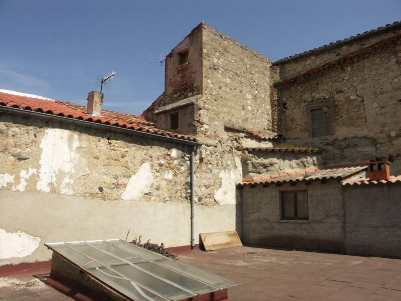 Enclos canonial. Maison 24 bd de l'Agly. Vieux clocher. Parcelle 300-301. Le clocher primitif de l'église vu depuis le cloître.