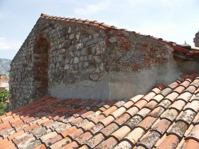 Enclos canonial. Maison 24 bd de l'Agly. Vieux clocher. Parcelle 300-301. La partie supérieure du mur occidental de l'église, vue depuis le toit de la maison qui a englobé l'ancien clocher.