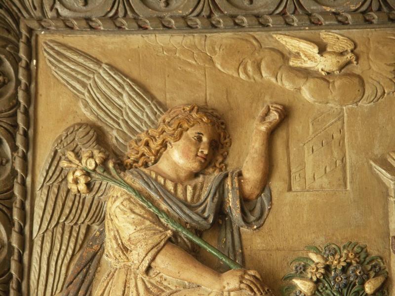 Enclos canonial. Maison canoniale 1 rue du Dr Monnier. Parcelle 292. 1er étage. Salle avec une cheminée ornée d'une Annonciation en gypserie. Ange Gabriel, lys, colombe, tour, nuées.