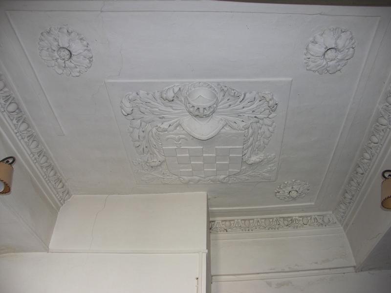 Enclos canonial. Maison canoniale 1 rue du Dr Monnier. Parcelle 292. 2e étage. Chambre donnant sur le jardin. Plafond orné de gypseries. Blason de chanoine.