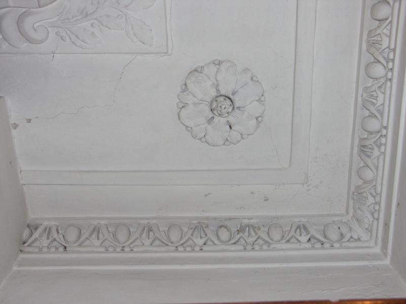 Enclos canonial. Maison canoniale 1 rue du Dr Monnier. Parcelle 292. 2e étage. Chambre donnant sur le jardin. Plafond orné de gypseries, cordon d'oves et griffes et rosaces aux angles.