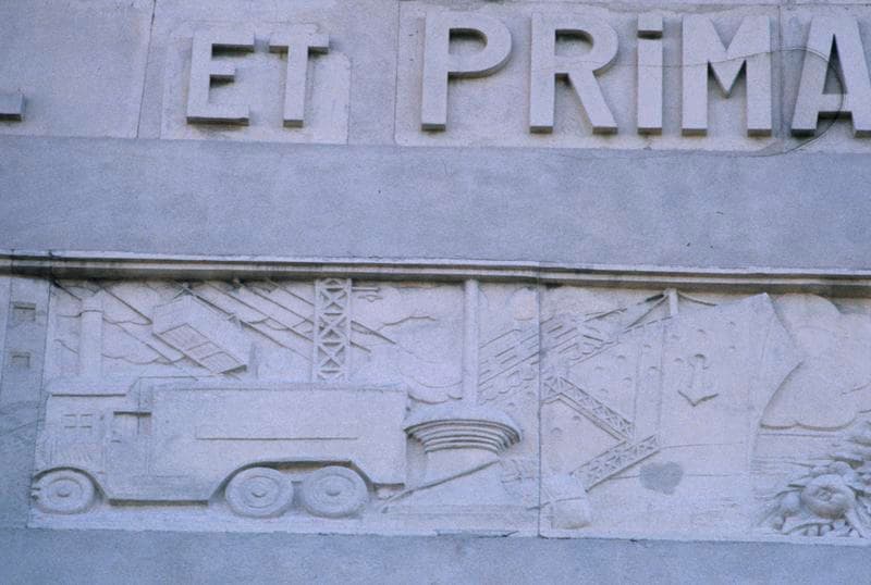 Façade sur rue Dhuoda, frise encadrant l'entrée par André Méric.
